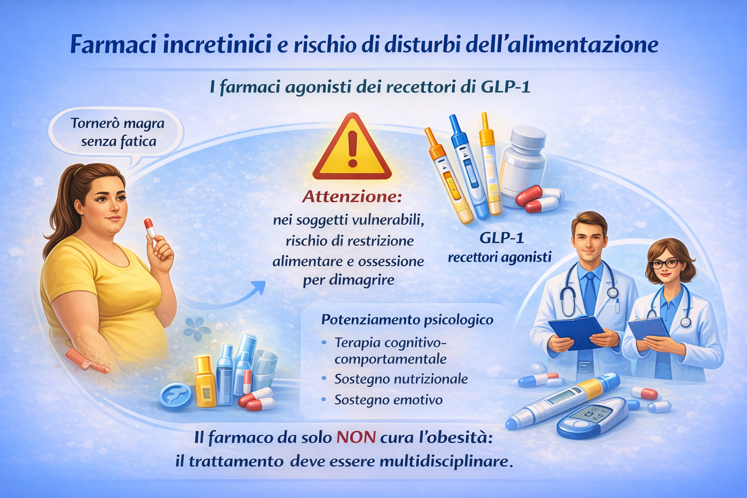 Tuttavia, dal punto di vista di una cultura della cura attenta ai disturbi dell’alimentazione, è fondamentale evitare una visione riduzionistica. La perdita di peso indotta farmacologicamente non coincide automaticamente con un miglioramento del benessere psicologico o della qualità della relazione con il cibo.